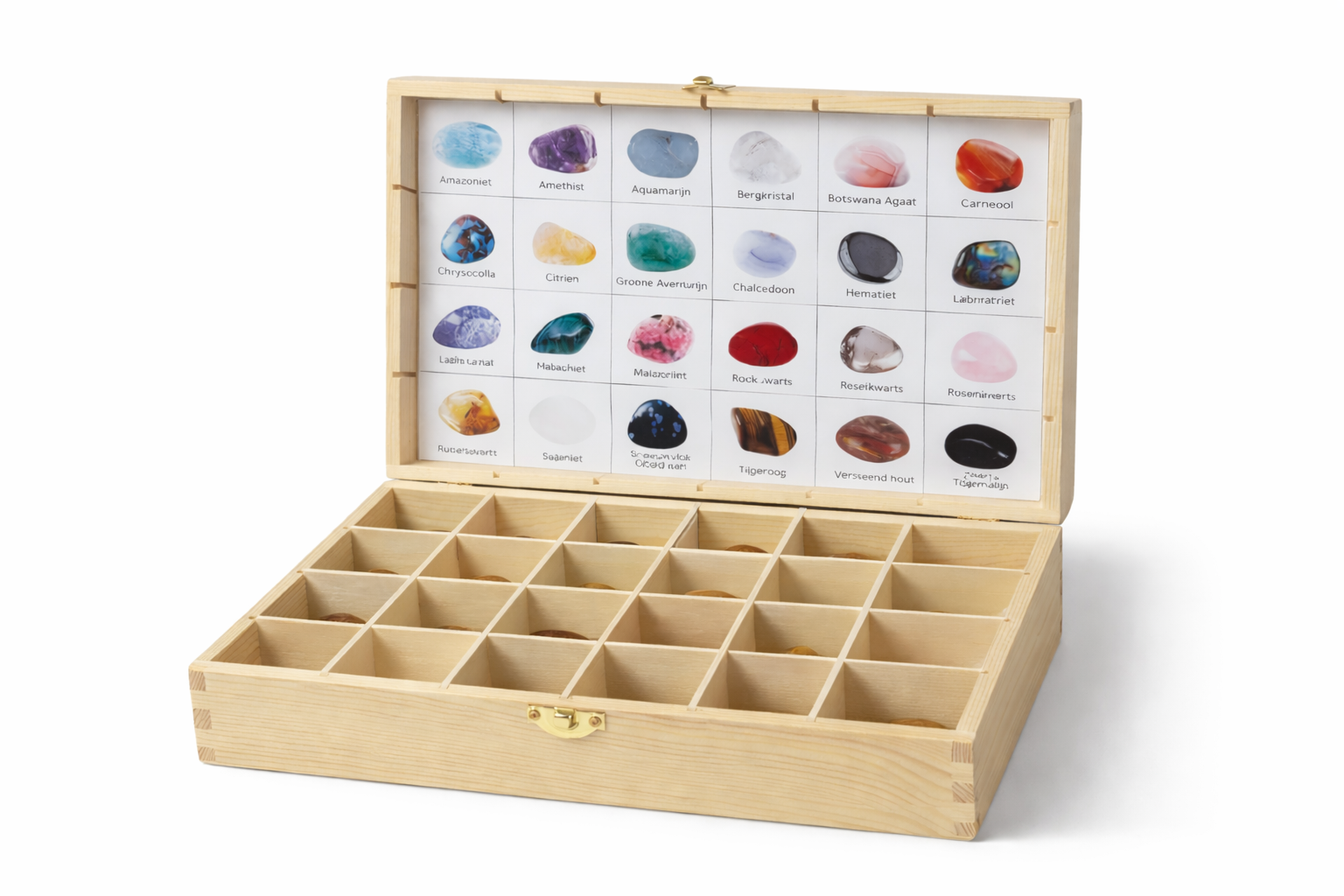 Amazoniet perfect in één van de lege vakjes in de houten edelstenen verzamelkist past?