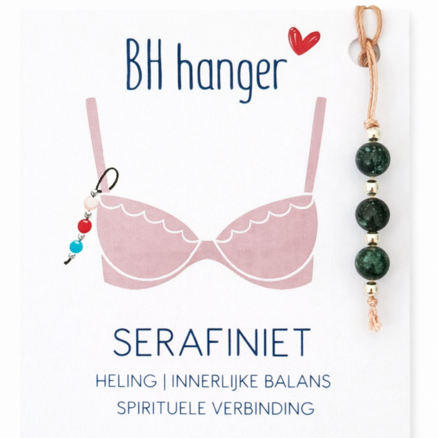 Serafiniet is een donkergroene steen met zilverachtige veerstructuren en staat bekend om zijn zuiverende en beschermende werking. Door zijn lage hardheid wordt serafiniet vooral verwerkt in hangers en cabochons.