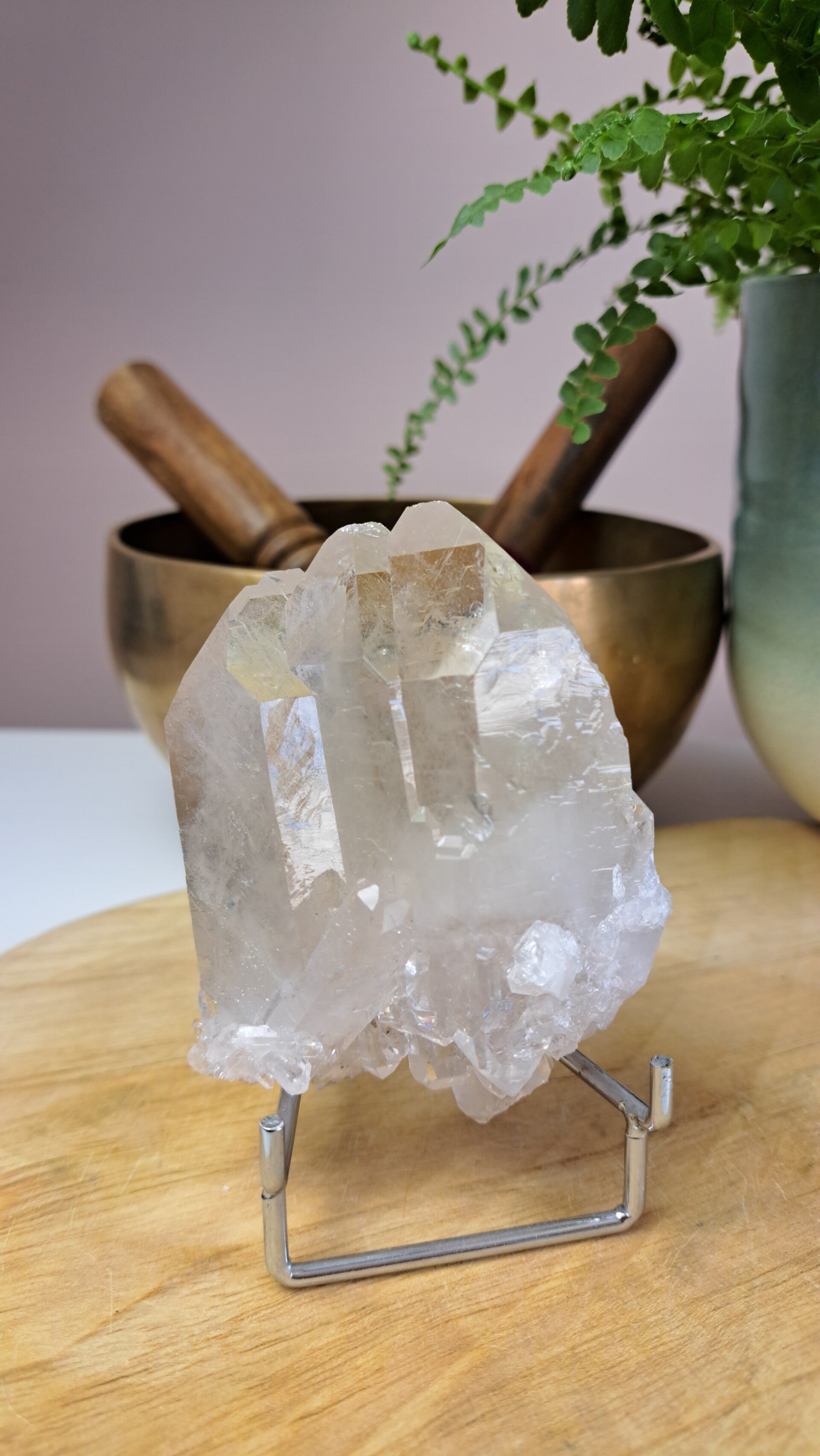 Ruw cluster van Bergkristal. De punten hebben prachtige helderheid en aan beide kanten van het cluster zitten kristalpuntwen. Dit cluster kan niet op zichzelf staan en heeft standaard nodig.