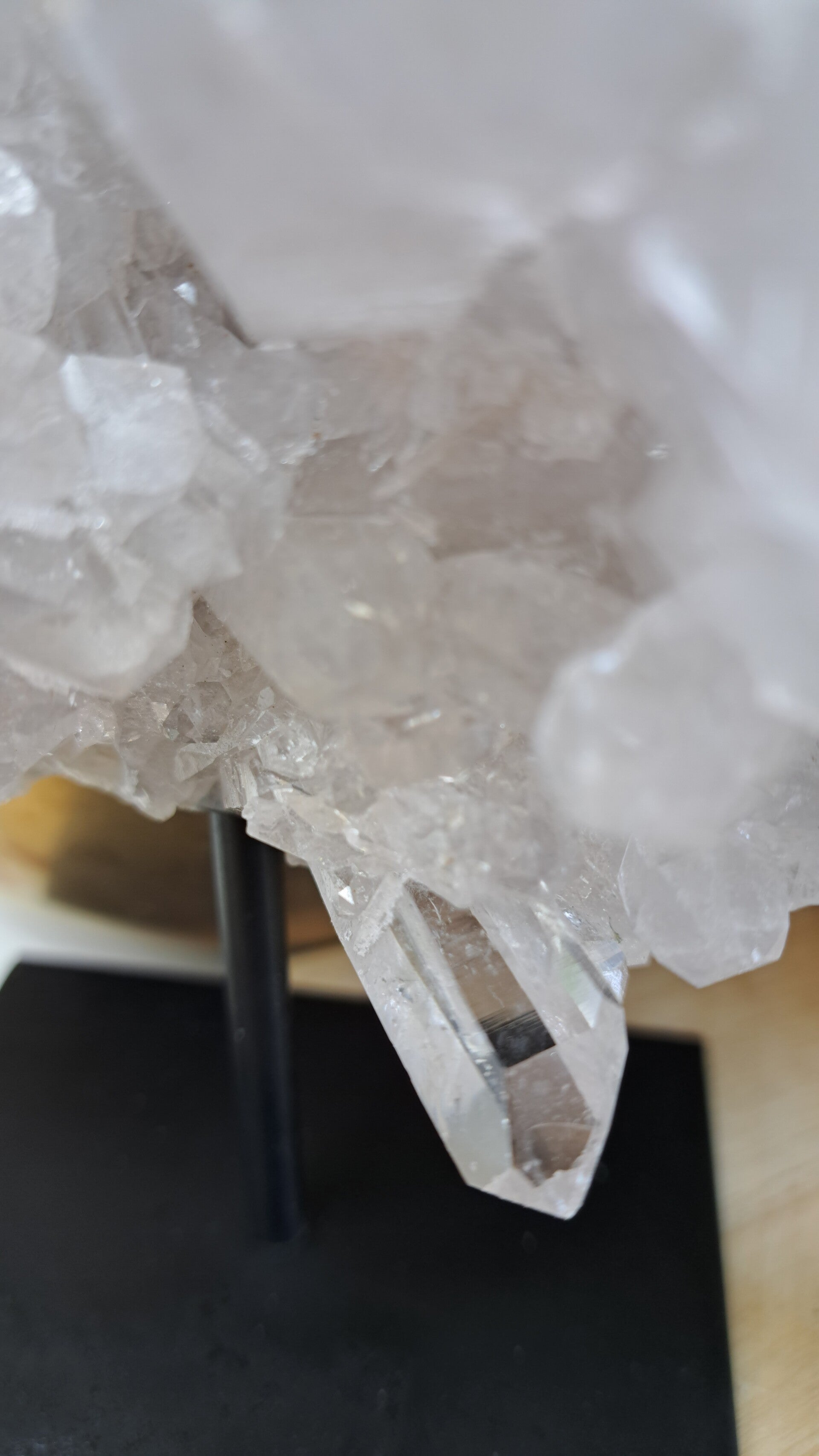 Ruw cluster van Bergkristal. Groot cluster op kwart met prachtig heldere kristalpunten.