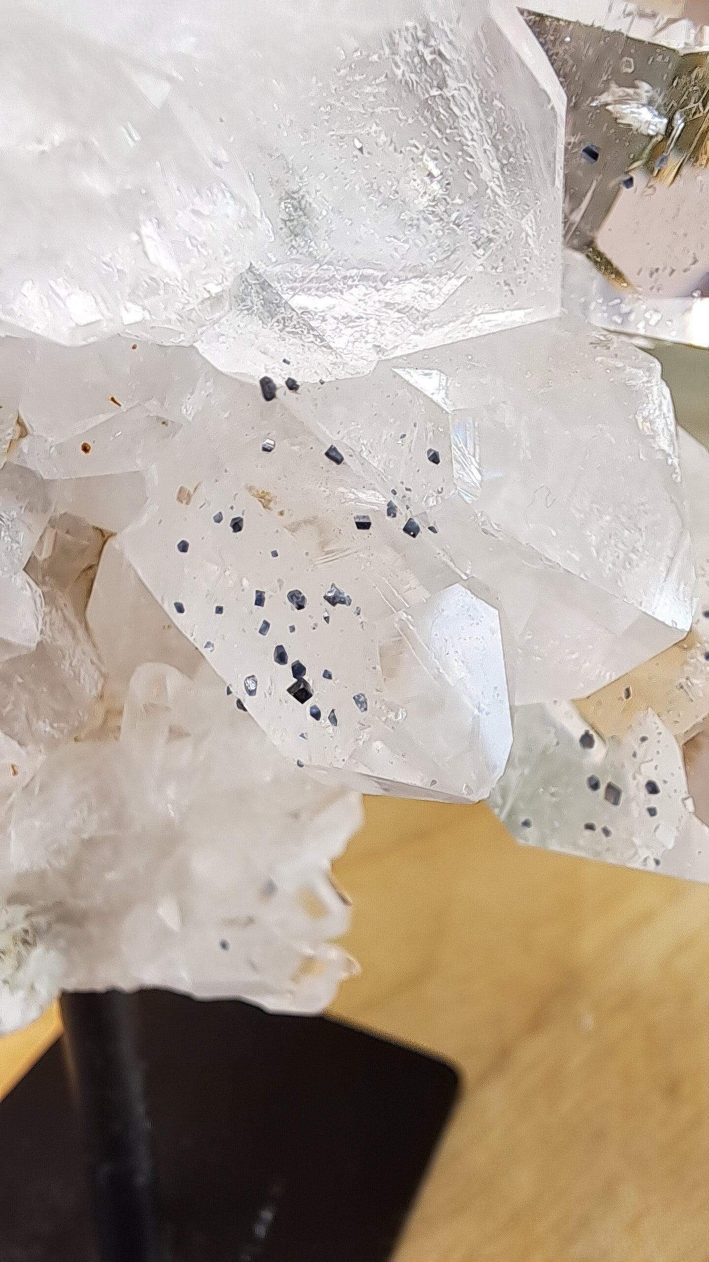 Ruwe heldere punten van Bergkristal. Op de kristallen hebben zich kleine kristallen van Hematiet en Anatase afgezet.