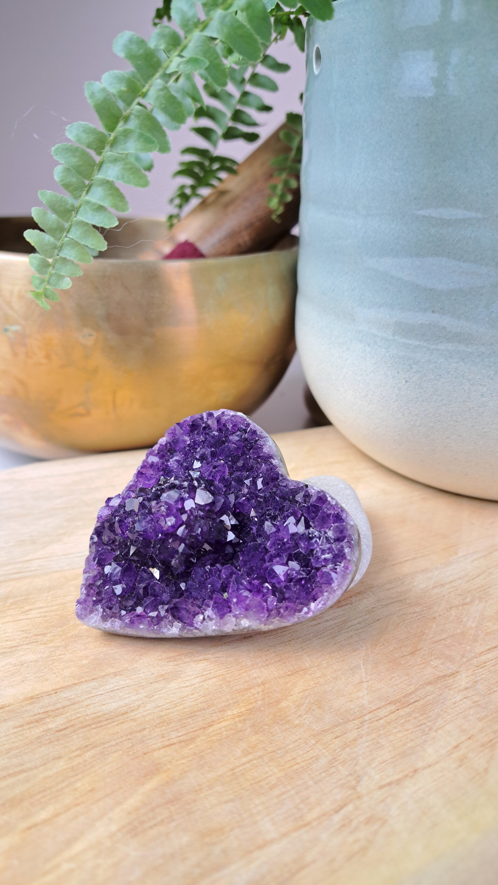 Dit hart is gemaakt van 100% natuurlijke steen. Het hart is rondom gepolijst en hebben een mooie glans. Middenin de Amethistkristallen zit een mooie grote en duidelijke flower van kristalpunten. De Amethistkristallen hebben een dieppaarse kleur.