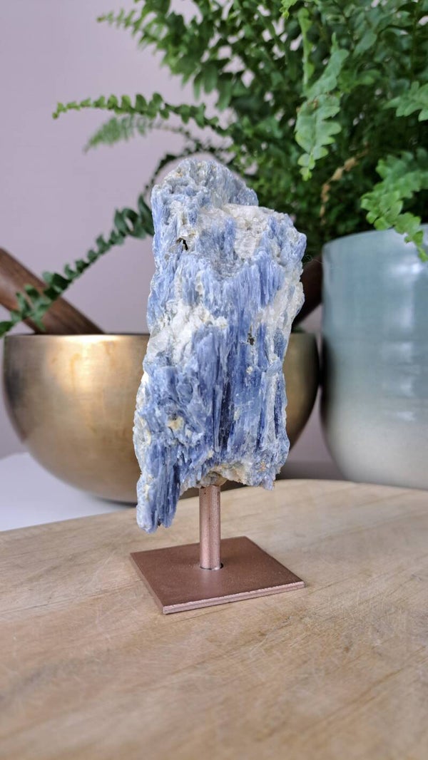 Kyaniet staat bekend om zijn harmoniserende werking op lichaam en geest. Een krachtige steen die communicatie, felxibiliteit en rust ondersteunt. Deze prachtige Kyaniet op rose gold standaard komt uit Brazilië.
