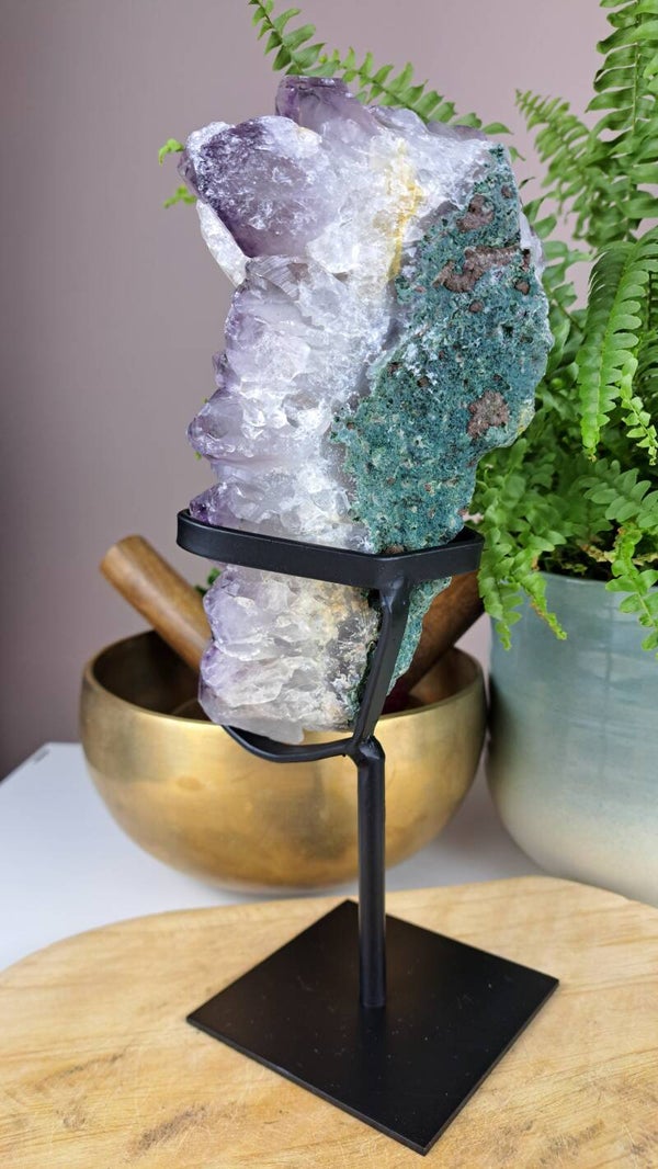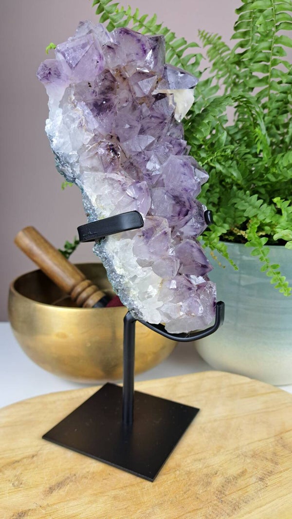 Amethist cluster ruw. Dit cluster bevat ook Calciet. Calciet kan je helpen bij mentale helderheid, focus en emotionele balans.