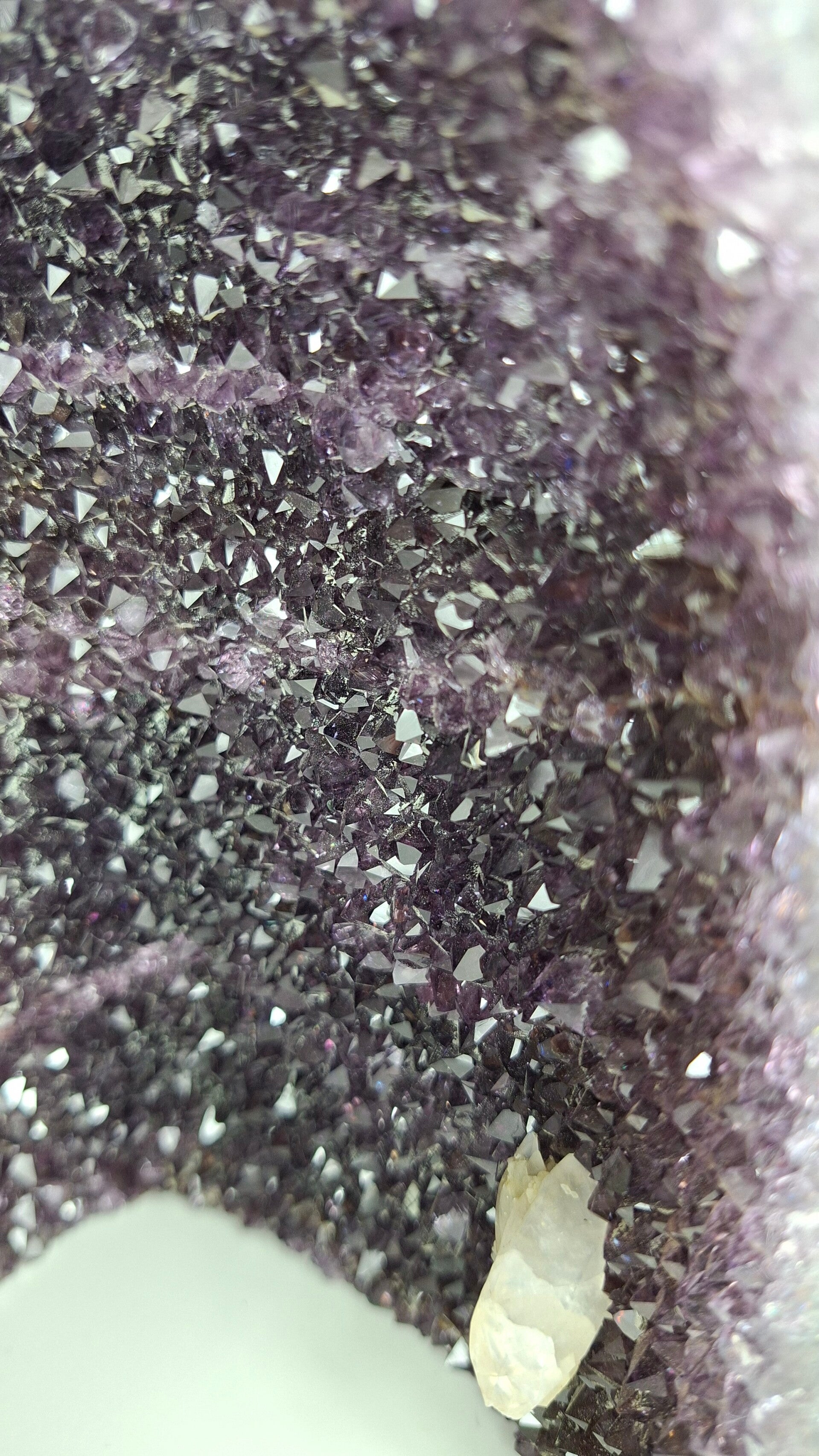 Mooie Amethist geode met dieppaarse kristallen. Dit stuk bevat Agaatranden en Calcietfromaties. Geode kan op zichzelf staan.