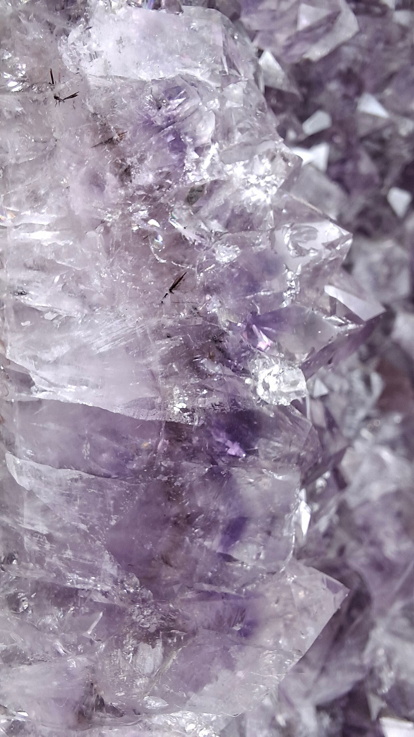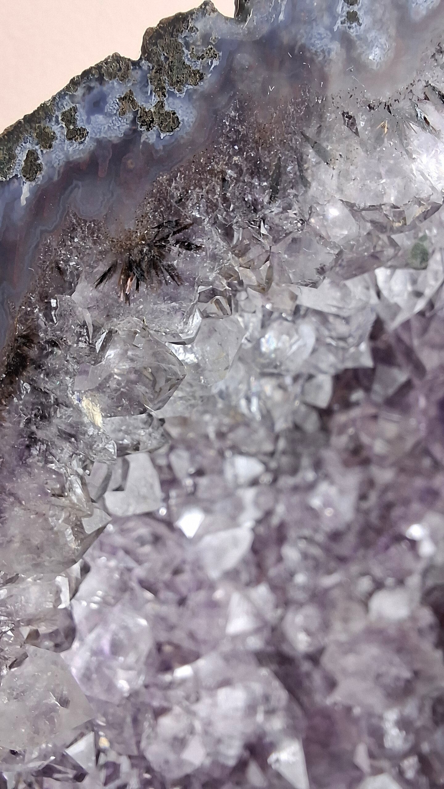 Mooie Amethist geode met paarse kristallen en diverse inclusies van Goethiet en Hollandiet. Verder heeft deze geode ook Agaat, sugar druze en Chalcedoon. Geode kan op zichzelf staan. Er zijn in diverse kristallen fantomen zichtbaar.