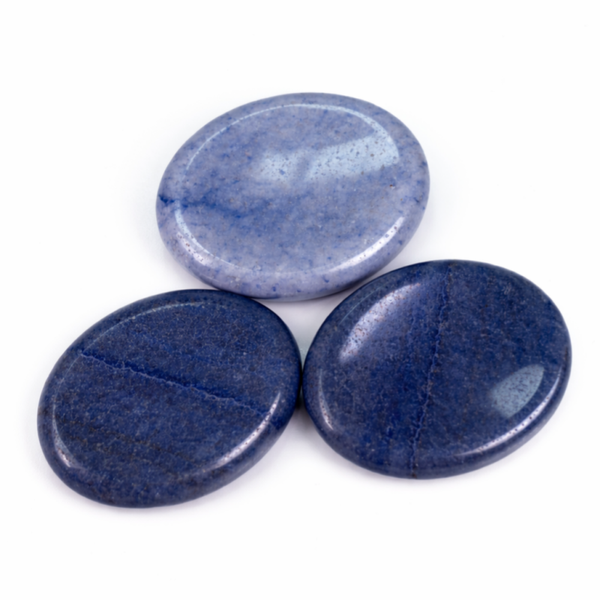Deze Blauwe Aventurijn duimsteen is een glad gepolijste, ovale steen met een lichte inkeping waarin de duim comfortabel past. Door deze vorm ligt de steen prettig in de hand en is hij geschikt voor dagelijks gebruik.