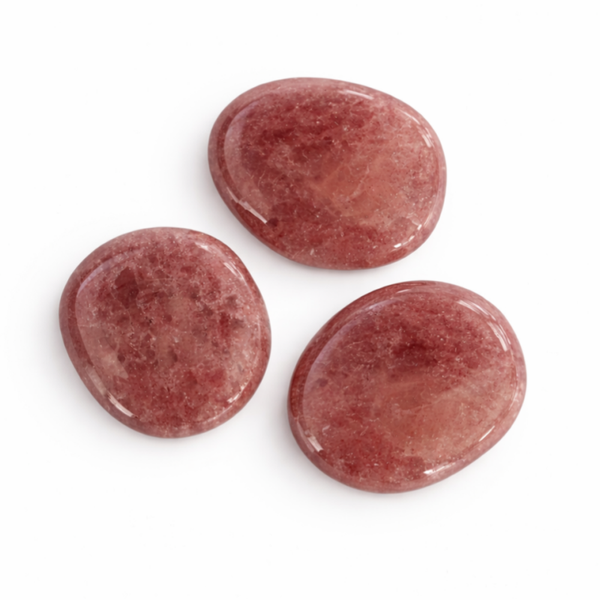 Aardbeienkwarts valt op door zijn warme roze tot roodachtige tinten en de fijne insluitsels die de steen zijn karakteristieke uitstraling geven. In deze Aardbeienkwarts oplegsteen zijn vaak kleine sprankelende puntjes zichtbaar die doen denken aan de kleur van rijpe aardbeien.