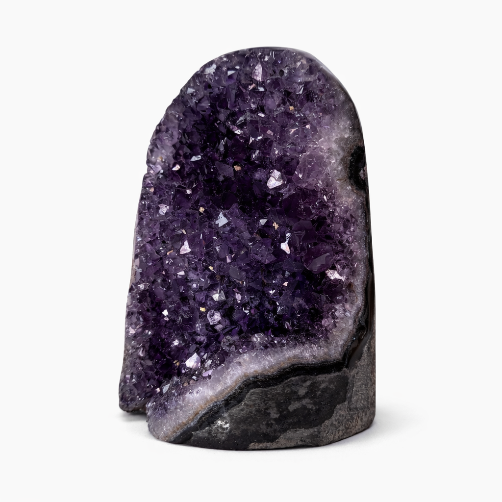 De onderzijde is vlak geslepen en gepolijst, waardoor de Amethist stabiel kan staan. Aan de voorzijde blijven de natuurlijke kristalpunten zichtbaar, die het licht op een levendige manier weerkaatsen en de karakteristieke structuur van de steen laten zien.