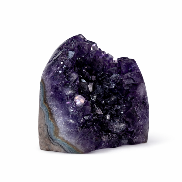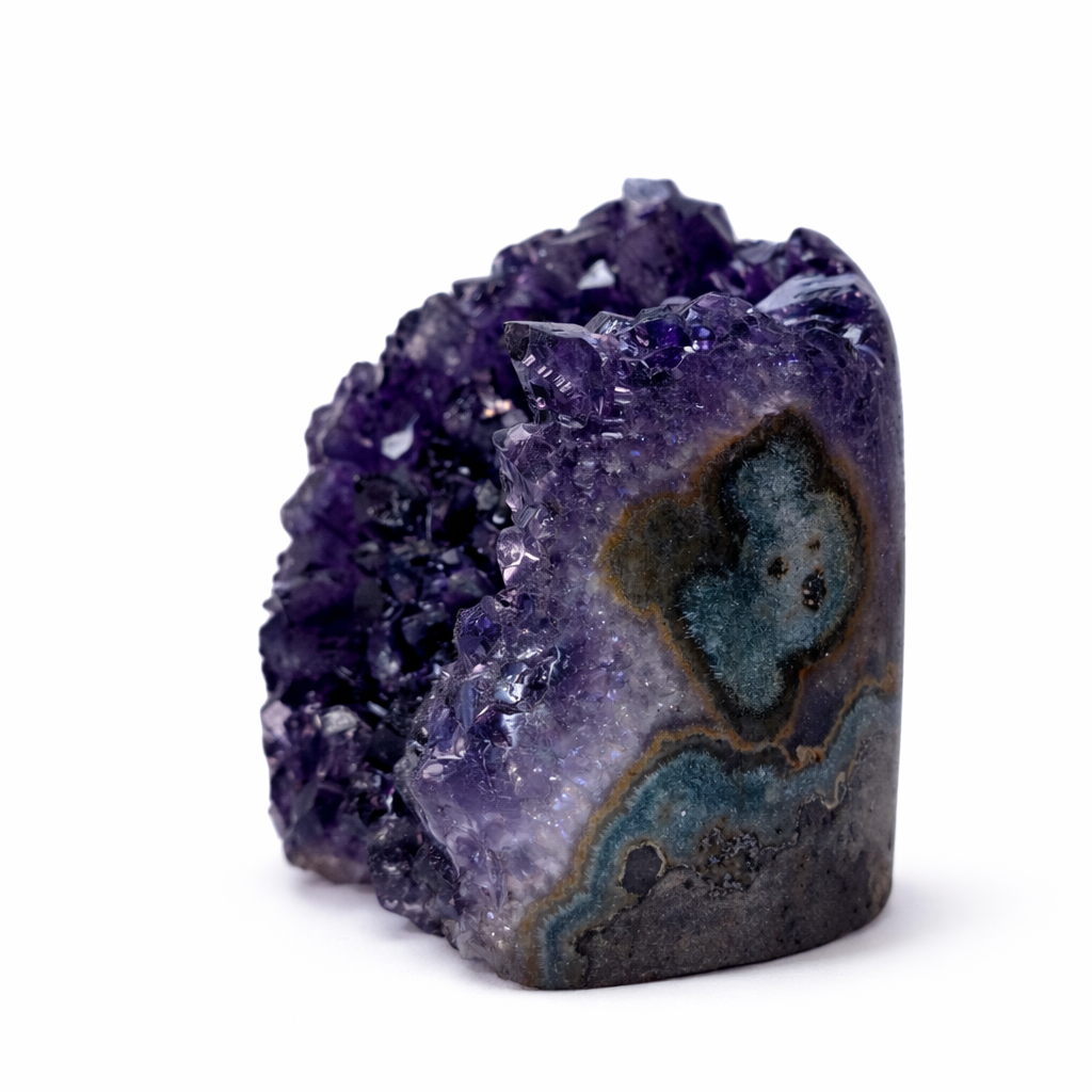 De onderzijde is vlak geslepen en gepolijst, waardoor de Amethist stabiel kan staan. Aan de voorzijde blijven de natuurlijke kristalpunten zichtbaar, die het licht op een levendige manier weerkaatsen en de karakteristieke structuur van de steen laten zien.