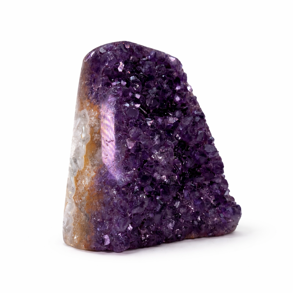 De onderzijde is vlak geslepen en gepolijst, waardoor de Amethist stabiel kan staan. Aan de voorzijde blijven de natuurlijke kristalpunten zichtbaar, die het licht op een levendige manier weerkaatsen en de karakteristieke structuur van de steen laten zien.