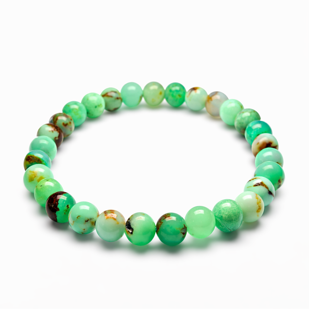 Deze Chrysopraas armband is opgebouwd uit ronde, glad gepolijste kralen van hoge kwaliteit, geregen op stevig elastiek. De kralen sluiten mooi op elkaar aan en vormen een rustige, strakke lijn rond de pols, waardoor de armband prettig en natuurlijk draagt.