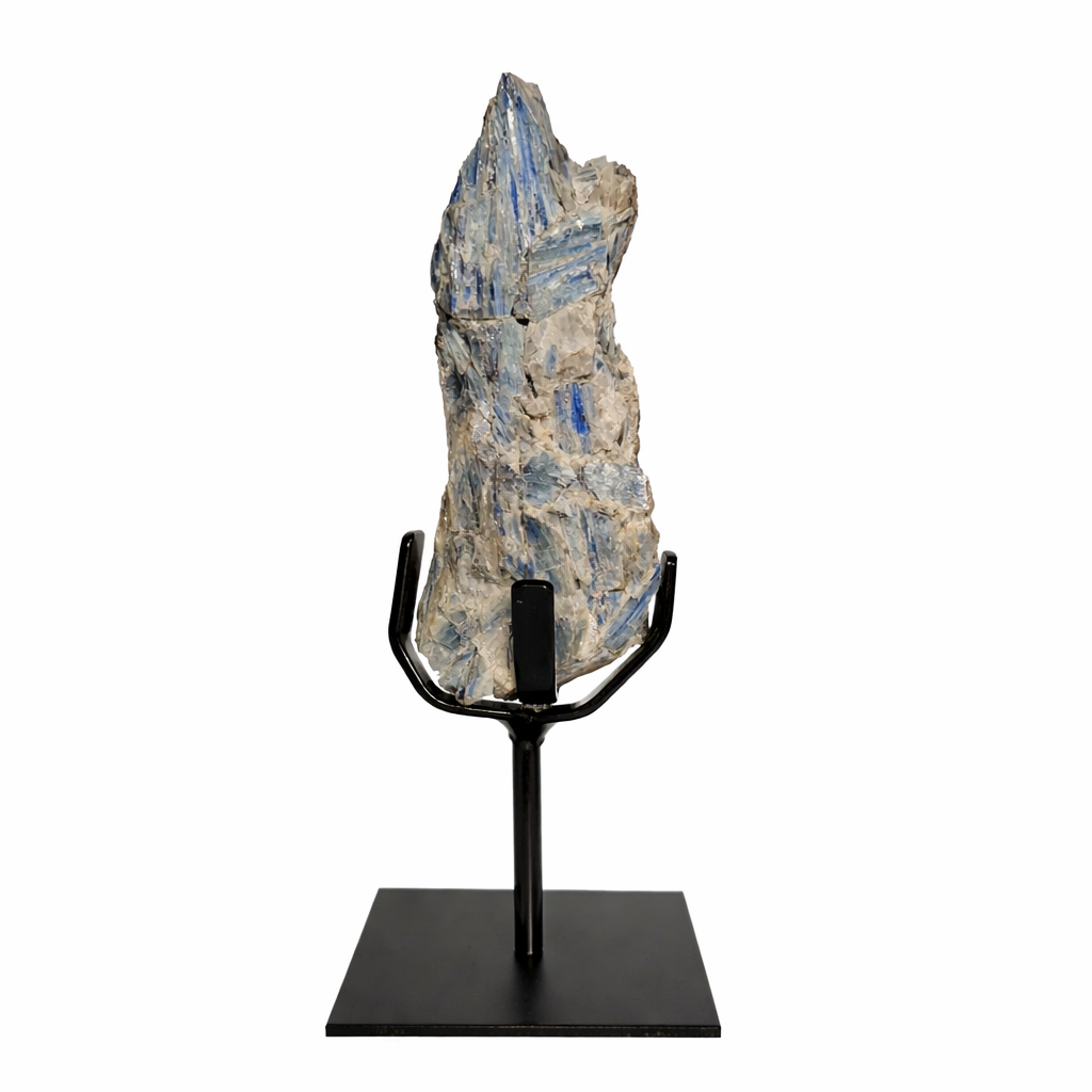 Deze blauwe Kyaniet op standaard staat bekend om zijn levendige blauwe kleur en heldere kristalstructuur. De natuurlijke tinten van de steen komen duidelijk naar voren en variëren van zacht ijsblauw tot diep kobaltblauw, waardoor elk stuk een unieke uitstraling heeft.