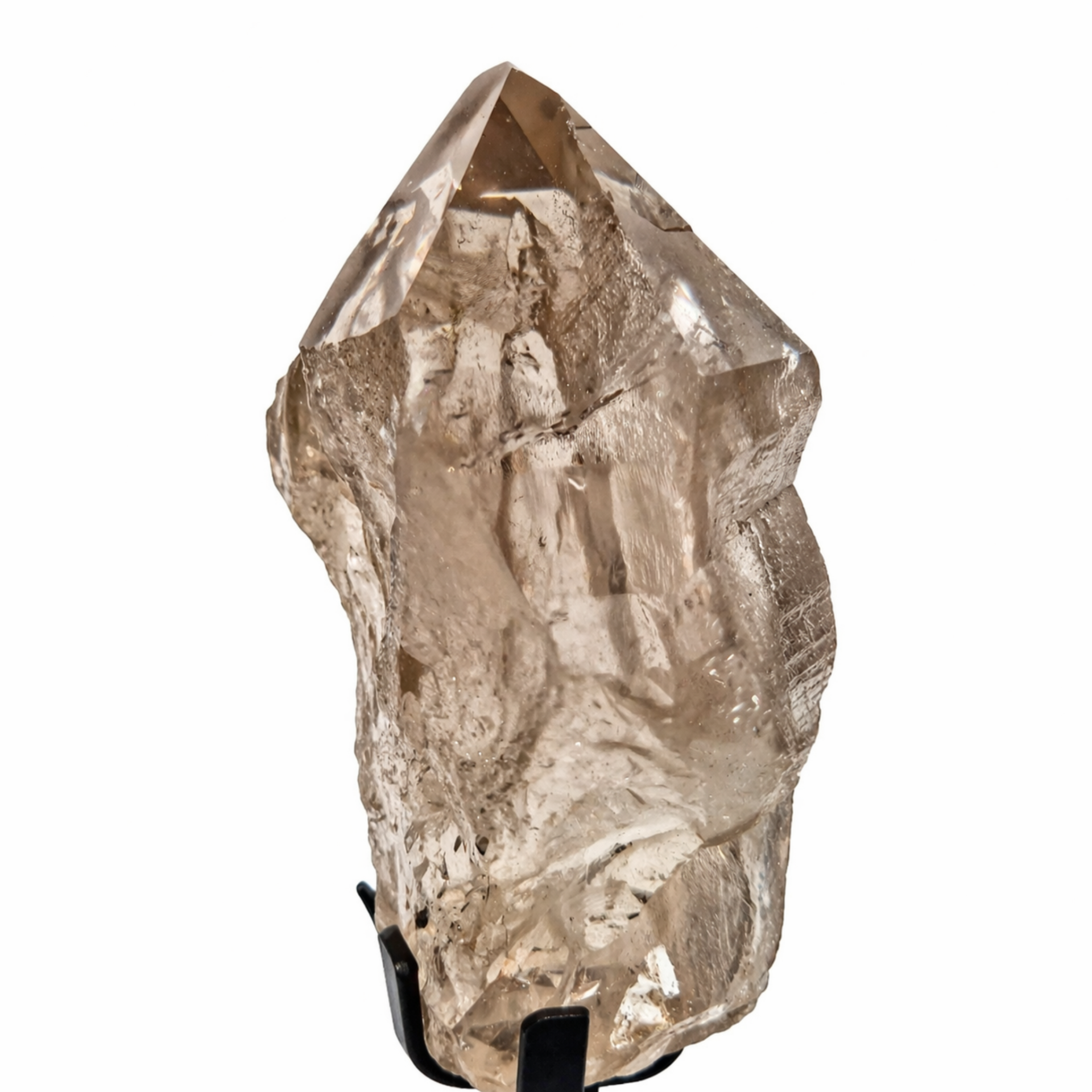 Deze Rookkwarts op standaard heeft een diepe, rokerige kleur die varieert van zacht transparant grijs tot warm bruin en soms bijna zwart. De kleur loopt door het kristal heen en geeft elk stuk zijn eigen, natuurlijke gelaagdheid. Door de helderheid van het kwarts zie je de interne structuur en de subtiele nuances in tinten duidelijk terug.