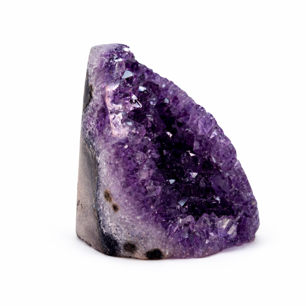 De onderzijde is vlak geslepen en gepolijst, waardoor de Amethist stabiel kan staan. Aan de voorzijde blijven de natuurlijke kristalpunten zichtbaar, die het licht op een levendige manier weerkaatsen en de karakteristieke structuur van de steen laten zien.